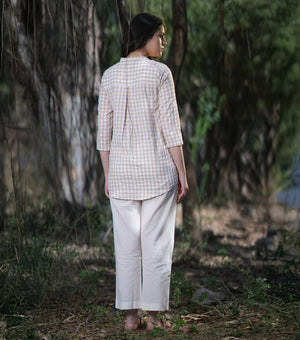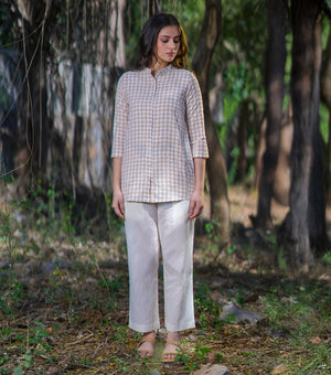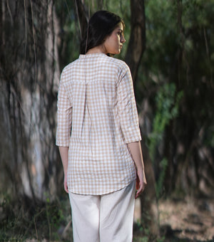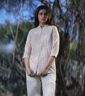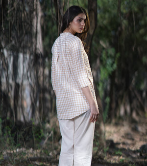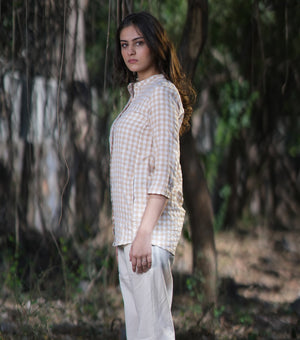 A study in subtle texture and relaxed tailoring. This shirt is cut from soft woven cotton with a muted check pattern in beige and natural tones. The collarless neckline and three-quarter sleeves keep the silhouette minimal, while the boxy fit adds ease and movement. Finished with a button-down front and side seam detailing, it’s designed for everyday wear with a thoughtful edge.