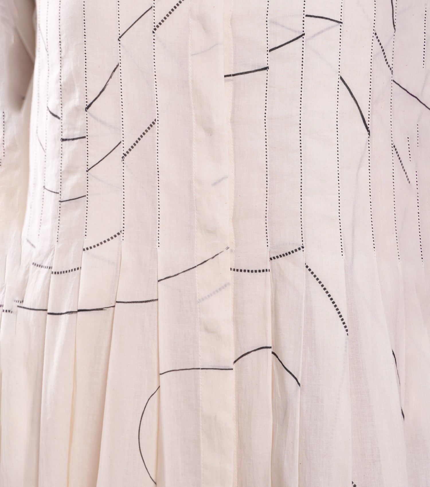 The subtle digital print adds a contemporary touch, while the pintuck detailing on the yoke brings in texture and refined structure. Designed with a clean round neckline and three-quarter sleeves, it balances minimal aesthetics with functional ease, making it suitable for both casual and semi-formal settings.