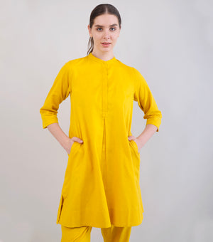 - Featuring a mustard solid woven cotton tunic with a front-button placket detail, inverted box-pleat and side-seam pockets. It is paired with matching solid mustard straight fit pants.
