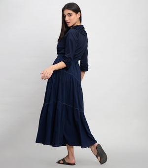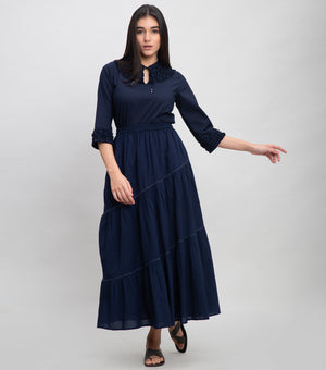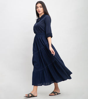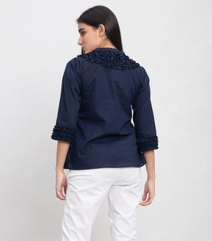 Navy Cotton Top with Ruffle Detail On Neck & Cuff Sleeve