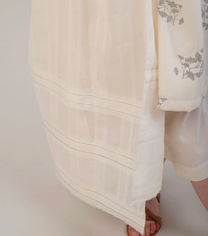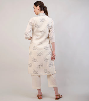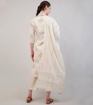 - Featuring an off-white printed cotton knee-length kurta accentuated with printed floral motifs and thread top stitches highlighted on the collar. It is paired with matching solid off-white pants and an off-white self-woven dupatta.