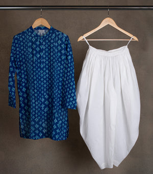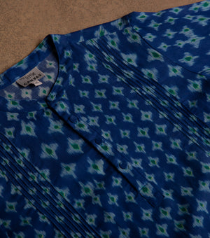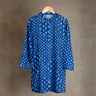 Featuring a royal blue woven and printed cotton silk knee-length kurta for boys with a front-button placket detail.