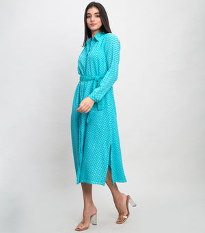 Aqua Blue Cotton Printed Shirt Dress with Belt & Lace Detailing