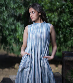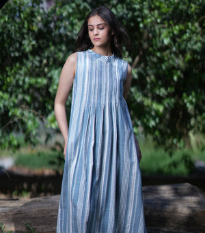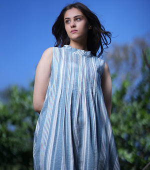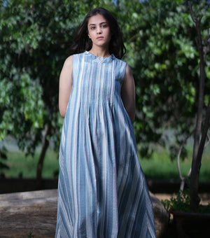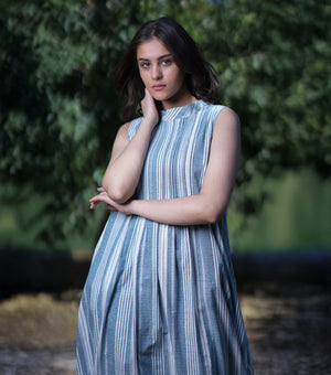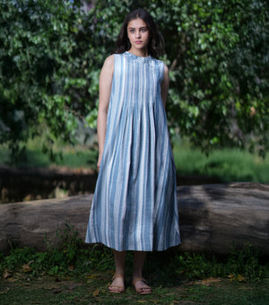A dress that feels like summer. Crafted from breathable woven cotton, this sleeveless midi features soft blue stripes that evoke ease and clarity. The silhouette is relaxed yet refined, with a gentle flare that moves with you. A clean neckline and subtle pleating near the hem add shape without fuss.