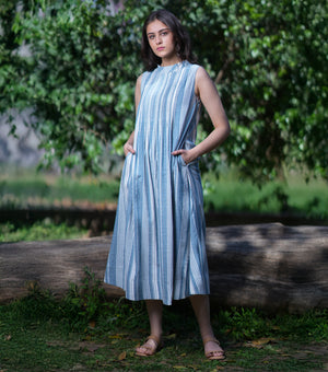 Blue Woven Cotton Stripe Sleeveless Midi Dress