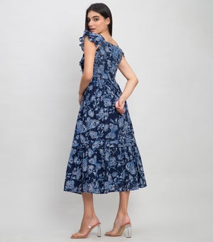 Navy Cotton Printed Midi Dress with Smocking & Stitch line