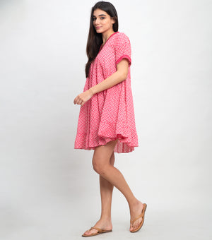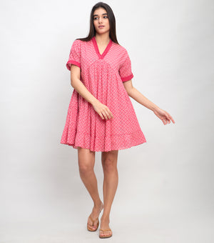 Printed Mini Dress with Pleats On Neck & Cuff Sleeve