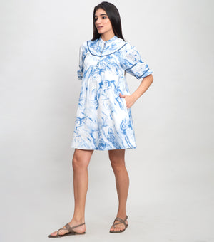 Sky Blue Cotton Printed Mini Dress with Lace Detail
