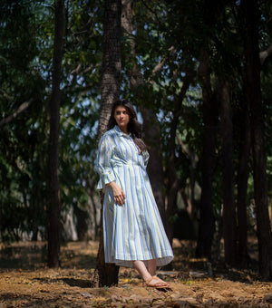 The vertical stripe pattern in calming shades of blue, green, and white adds a fresh, modern vibe, while the collared neckline and button-down front give it a timeless, shirt-dress feel. Finished with charming ruffle cuffs and adjustable tie details at the sleeves, this midi dress is perfect for casual outings, weekend brunch, or even a relaxed office look.