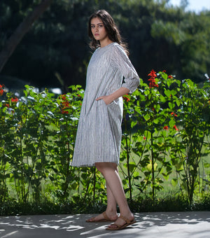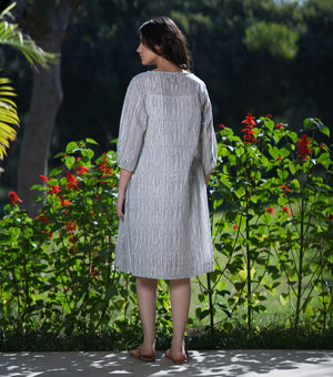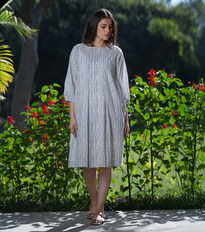 Soft cotton, subtle print, and a silhouette that moves with ease. This dress is crafted in breathable cotton with a delicate all-over print that adds quiet character. The relaxed fit and midi length make it ideal for warm days, while the clean neckline and three-quarter sleeves keep the look polished. A matching slip offers comfort and coverage.
