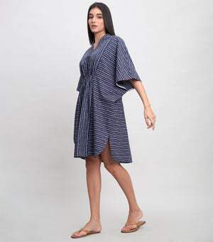 Navy Cotton Printed Coverup with Elastic & Lace Detailing