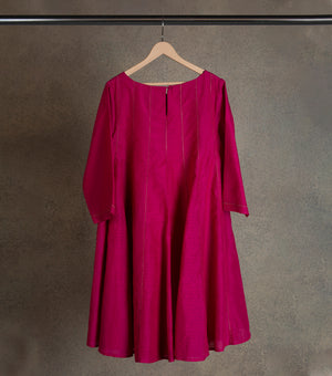 • Featuring a hot pink flared kali cotton kurta embellished with slight embroidery detail on the kalis and sleeves, back potli buuton detail for closure. It is paired with matching pink cotton pants and a crushed cotton dupatta.