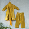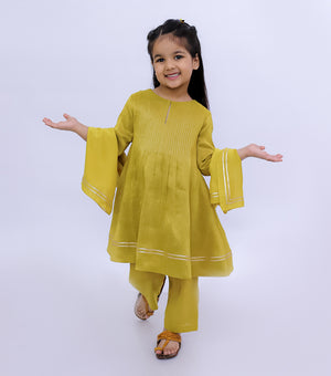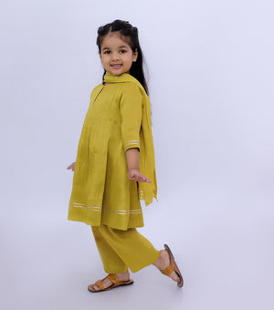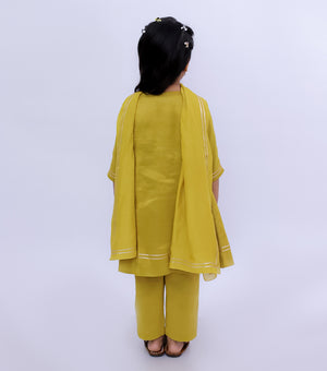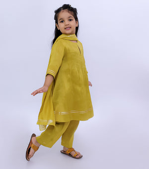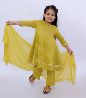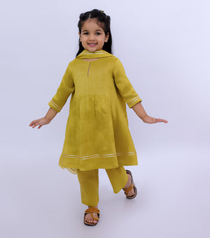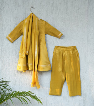 Mustard Pleated Tissue A-line Gota Kurta Set with Pants & Dupatta for Girls