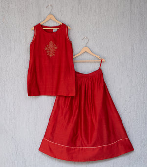 Red Chanderi Embroidered Kurta & Lehenga Set