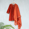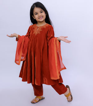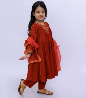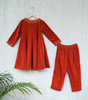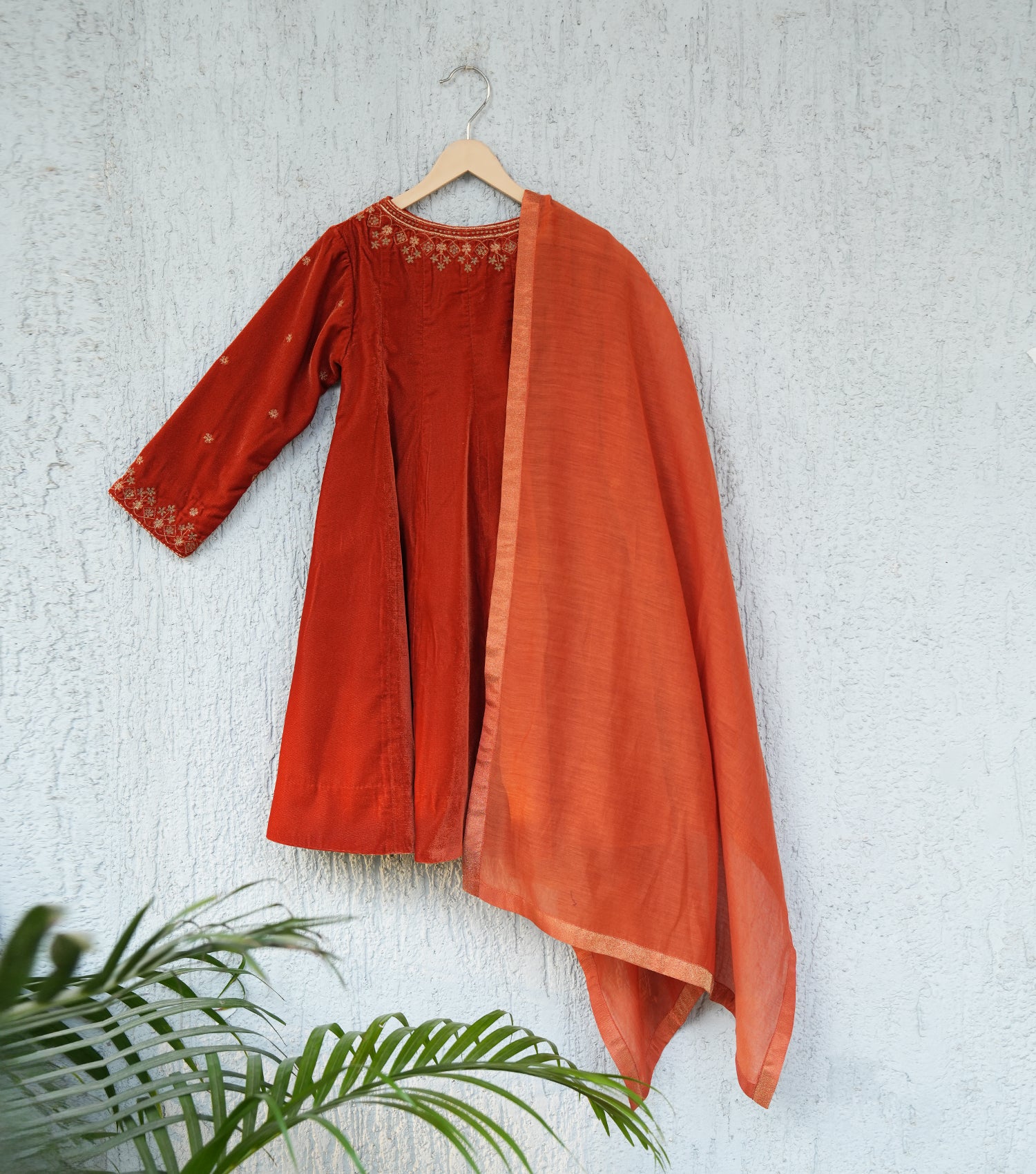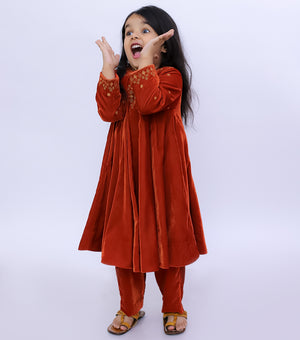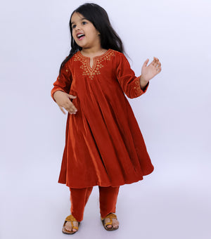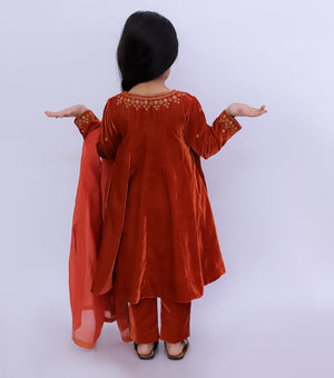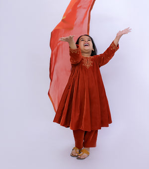 Rusty Orange Embroidered Velvet A-line Kurta Set with Pants & Dupatta for Girls