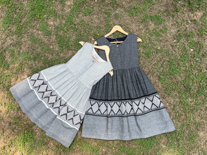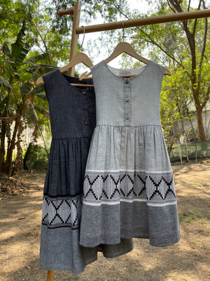 • Upgrade your little one's summer wardrobe with our Woven Design Gathered Dress. Crafted from breathable cotton fabric in grey and black, it's perfect for sunny days. The button-down design and gathers near the waist add flair, making it ideal for both casual and special occasions. Treat your girl to comfort and style now!