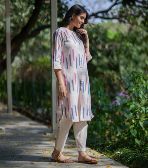 Ikat weaving meets contemporary ease in this multicolored kurta set. The handwoven texture carries depth and character, while the relaxed silhouette ensures comfort through long days. A piece that celebrates craft yet feels effortlessly modern.