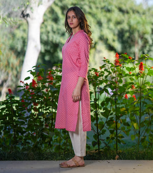 Add a fresh pop of color to your everyday wardrobe with this breezy pink cotton kurta set. Crafted from soft, breathable fabric, it features a charming all-over print, a classic V-neckline, and a straight silhouette for all-day comfort. Paired with matching dupatta and off-white pants, this versatile set is perfect for work, casual outings, or festive gatherings.