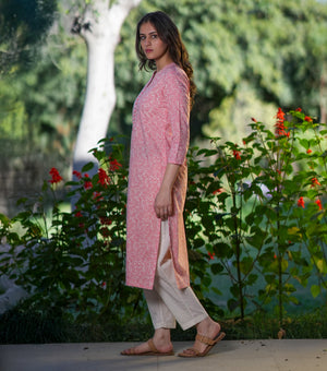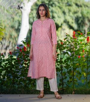 Soft cotton meets delicate print in this pink kurta set. Designed for everyday wearability, it brings a touch of gentle femininity without ever feeling overdone. Pair with flats for mornings on the move or keep it layered with minimal jewelry for evenings in.