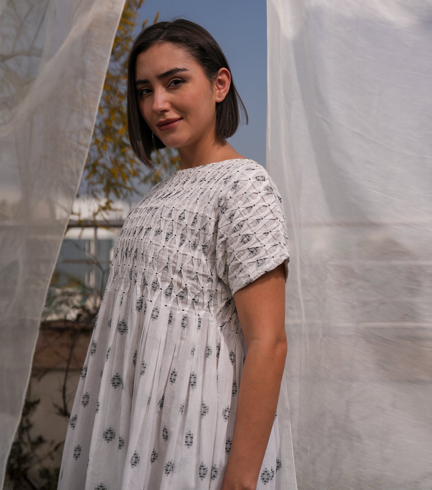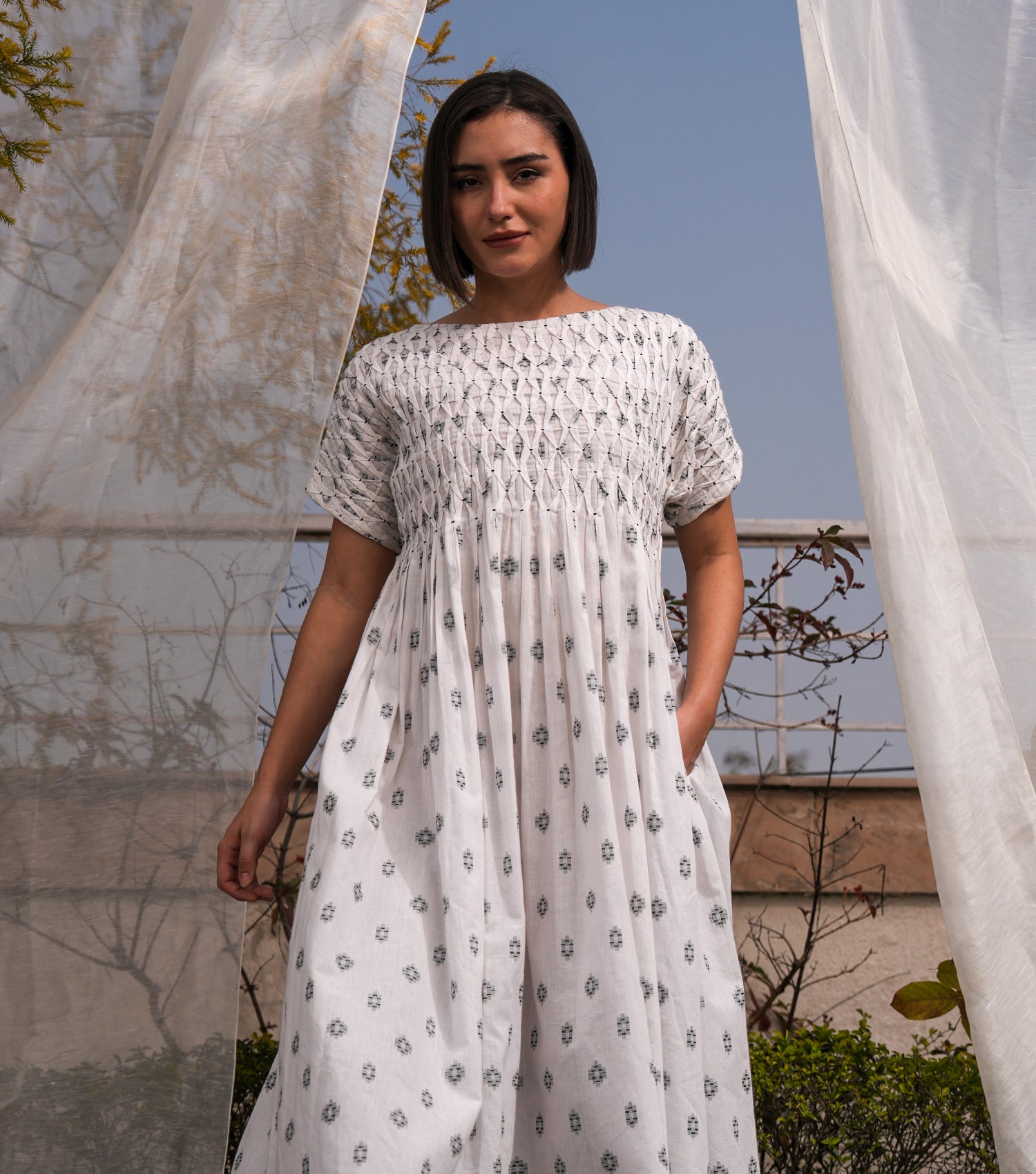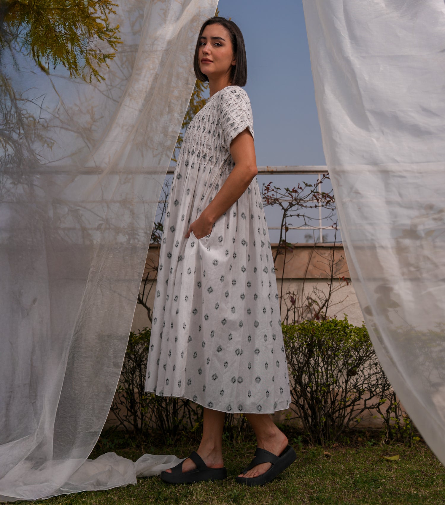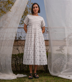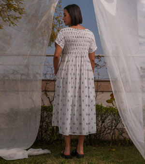 Smocked Yoke Woven Cotton Midi Dress